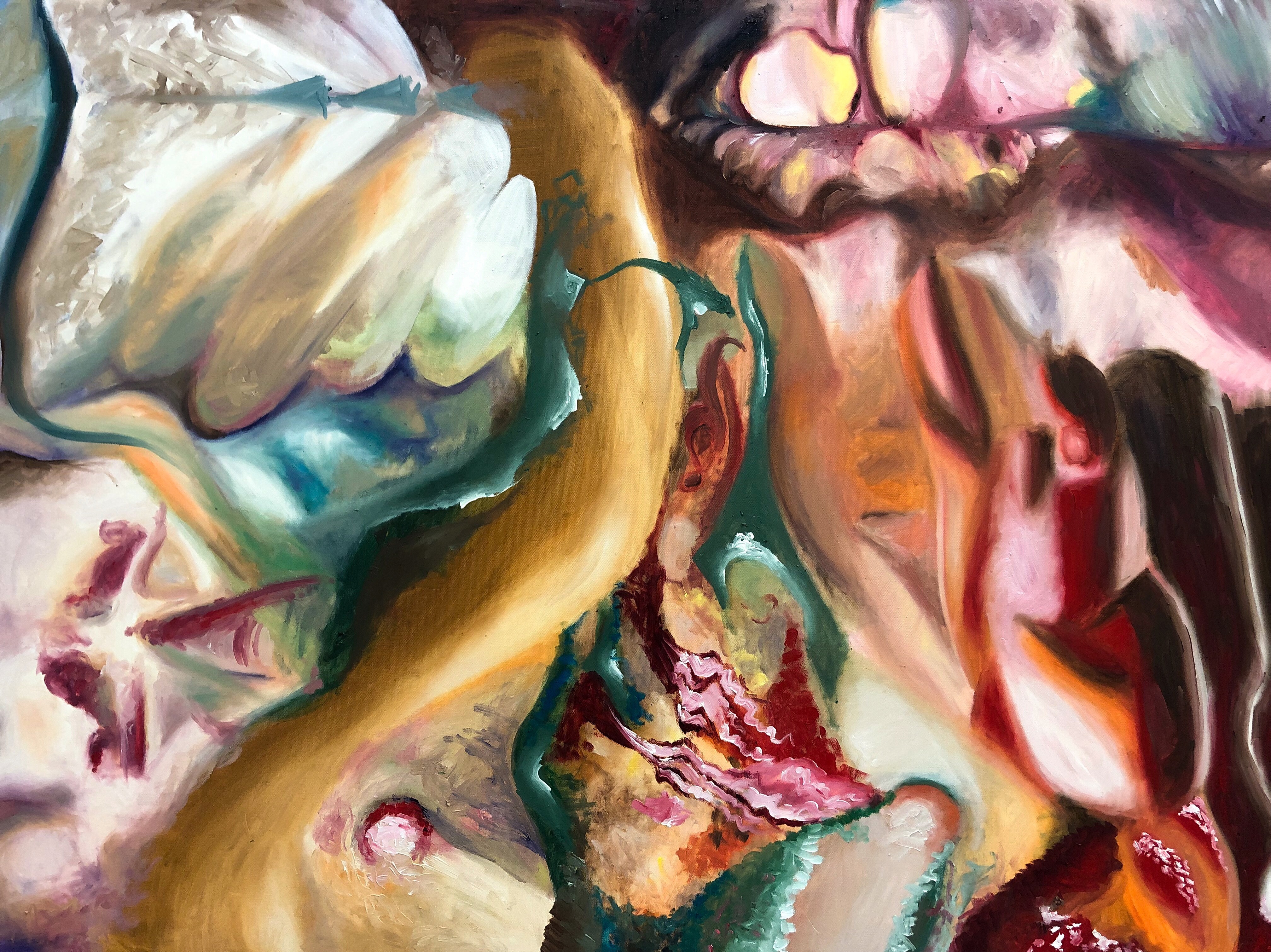 I use traditional materials like oil paint, charcoal, oil pastels, and colored pencils. Although the materials are traditional, I think it’s important to utilize them when expressing contemporary topics. I like to use oil paint when challenging ideas/social norms perpetuated throughout history that were created with oil paint.